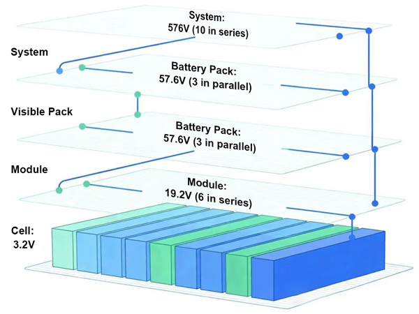 • El voltaje se determina por jerarquía: desde la celda individual (3,2 V) hasta el módulo (25,6 V), el paquete de baterías (~400 V) y, finalmente, el sistema (720 V), los niveles de voltaje se acumulan a medida que aumenta el nivel jerárquico.